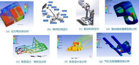 在课程设计体系方面,从机械设计、机械制造和智能控制三个层次,构建了能力递进式的模块化和项目制的课程实践。将传统的零散课程内认知体验式的实验模式,转化为综合性项目制的课程实践,建设了10门设课实验,形成了具有高阶性、创新性与挑战度的8个实验项目(如图5所示),编写了配套实验指导书4本,自制了教学仪器10种。以此打破传统多领域知识分散堆砌,以及基础课程教学与实践相互脱节的局面,通过能够体现不同领域知识特点的基础课程实践,到车辆工程专业以赛车研制为对象涉及整车多个系统培养解决复杂工程问题能力(如图6所示),将知识学习与实际应用相结合,形成了具有鲜明特色的层次化递进式课程实践体系。