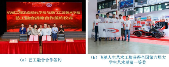 充分发挥学校工科、理科和艺术等多学科优势,汇集了德赢官网、厦门工艺美术学院、经管学院、电气学院、法学院等众多学科专业学生,组成跨界创新团队。飞驰人生艺术工坊获得全国第六届大学生艺术展演活动一等奖,是我校在美育类竞赛中取得的最高奖项。同时通过在“互联网+”、“挑战杯”、机械创新设计大赛、中美创客大赛等比赛中开展“寻找创新伙伴”活动、经验交流座谈会等活动,组成跨学院创新团队。其中在中美创客大赛总决赛中,共获得一等奖1项、二等奖2项,三等奖1项。
