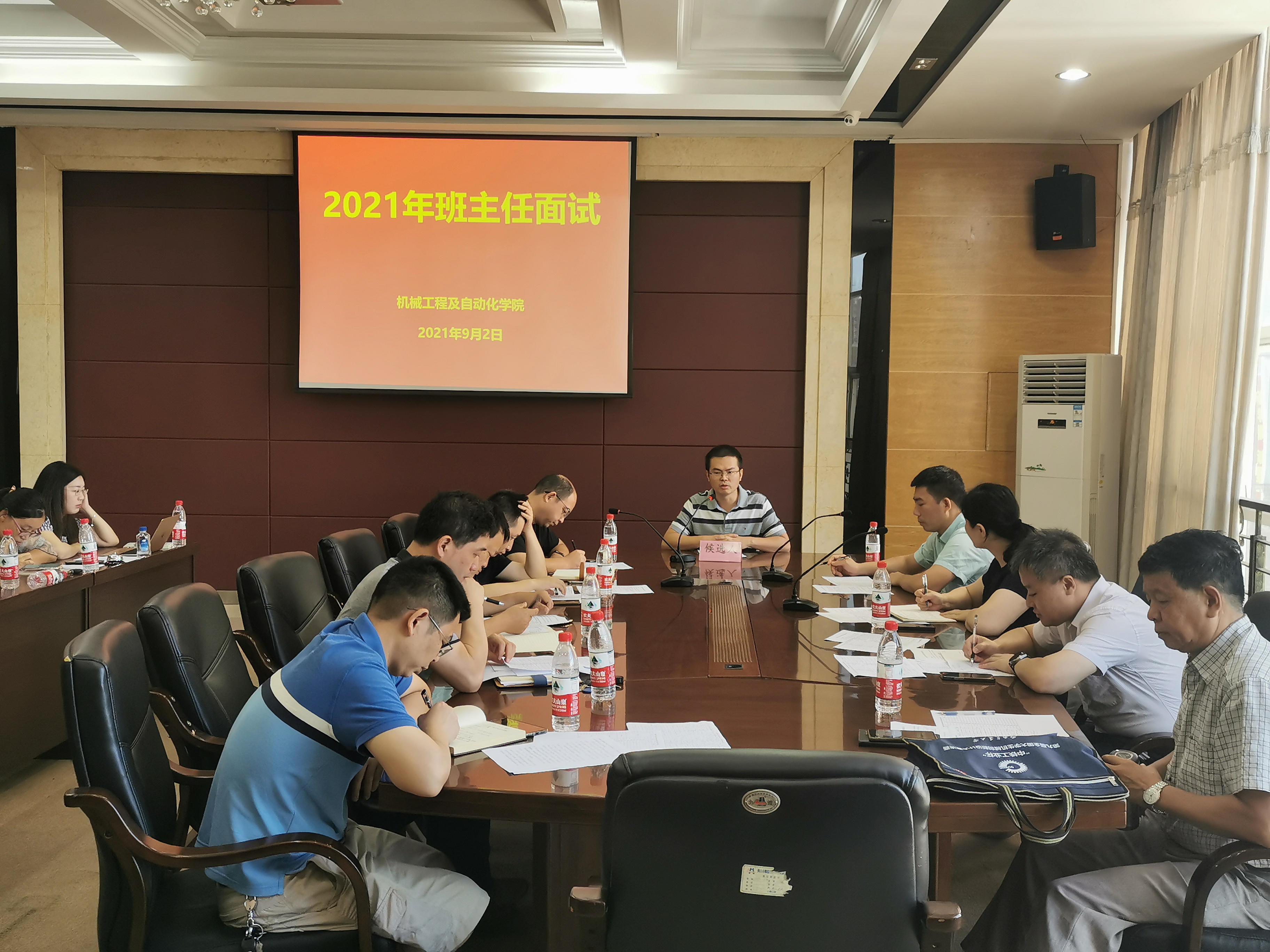 为进一步深入实施思想政治工作质量提升工程,大力推进“三全育人”综合改革,充分发挥班主任在学生学习教育管理中的作用,适应新形势下大学生思想政治教育和人才培养工作需要。9月2日上午,德赢官网在机械南楼401会议室举行2021年班主任选聘面试工作。院党委副书记(主持工作)叶青、院长钟舜聪、院党委副书记林文麟、副院长何炳蔚、副院长张俊、院关工委常务副主任蓝兆辉、系主任及学工组参加选聘面试会议。