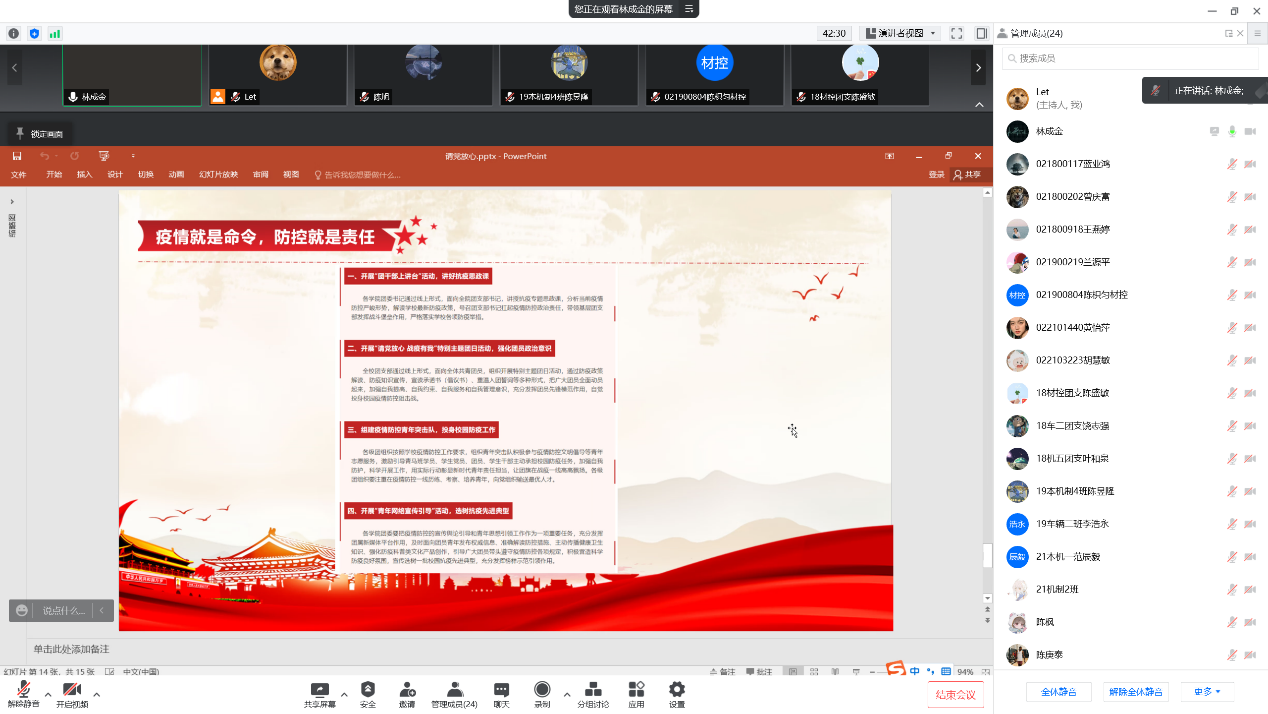 会议号召各团支部主动担当,积极作为,不断发挥基层团组织的号召力和凝聚力,通过形式多样的主题团日活动,鼓励团员们在疫情防控志愿服务中贡献自己的青春力量。