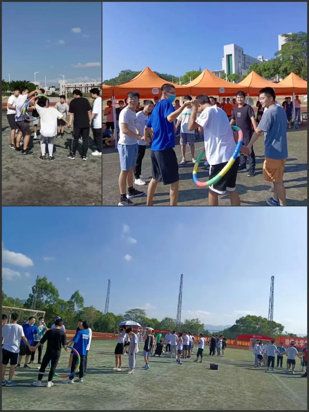 手拉手共穿呼啦圈,全员齐心,其利断金,协调配合,展现团队精神;