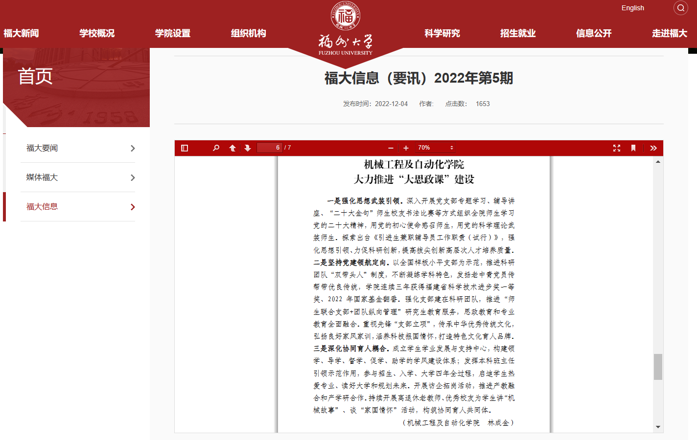 二是坚持党建领航定向。以全国样板小平支部为示范,推进科研团队“双带头人”制度,不断凝练学科特色,发扬老中青党员传帮带优良传统,学院连续三年获得福建省科学技术进步奖一等奖、2022年国家基金翻番。强化支部建在科研团队,推进“师生联合支部+团队纵向管理”研究生教育服务,思政教育和专业教育全面融合。重视先锋“支部立项”,传承中华优秀传统文化,弘扬良好家风家训,涵养科技报国情怀,打造特色文化育人品牌。