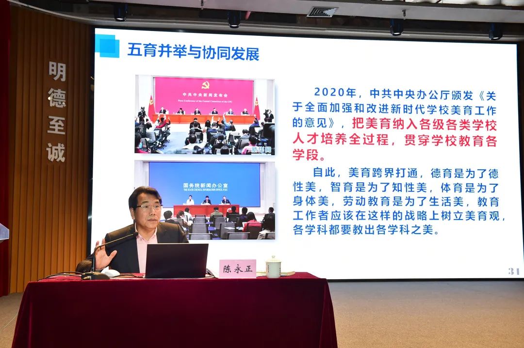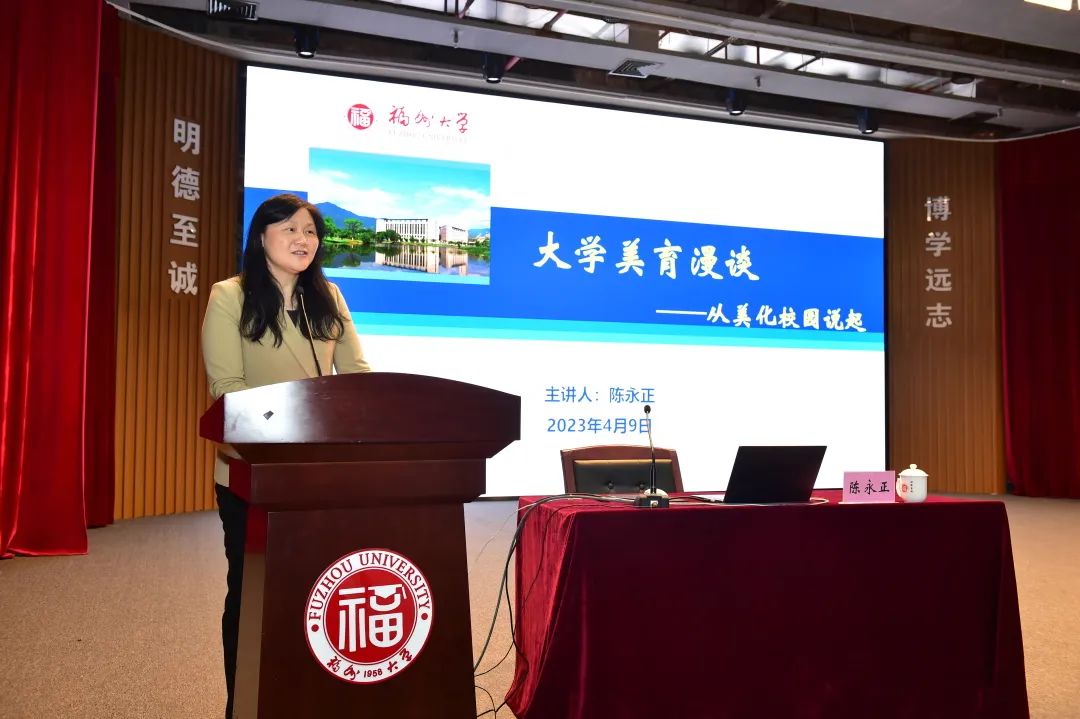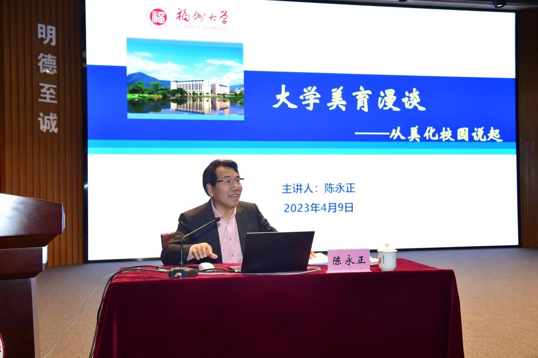 课上,陈永正教授从德赢ac米兰官方合作vwin美丽而独特的山水校园景观开始,结合世界知名大学的优美校园环境,深入阐述大学校园作为美育的重要载体对净化人的心灵、塑造美好人格的良好作用。陈教授阐述了马克思主义关于美的本质的论述,梳理了党的十八大以来党和国家关于美育工作的要求,强调了美育对促进大学生全面发展的重要作用。他从山水生态之美、现代科技之美、人文关怀之美、捐建共建之美等角度,深入解读了旗山校区山水校园自然景观和亭台楼阁等人文景观所蕴含的精神内涵,引导和鼓励学院师生要善于在日常学习、生活和工作中发现美、欣赏美、创造美。陈教授深入浅出、生动活泼的讲授,让与会师生们仿佛享受了一场“美”的思想和精神盛宴,赢得了老师和同学们的阵阵掌声。