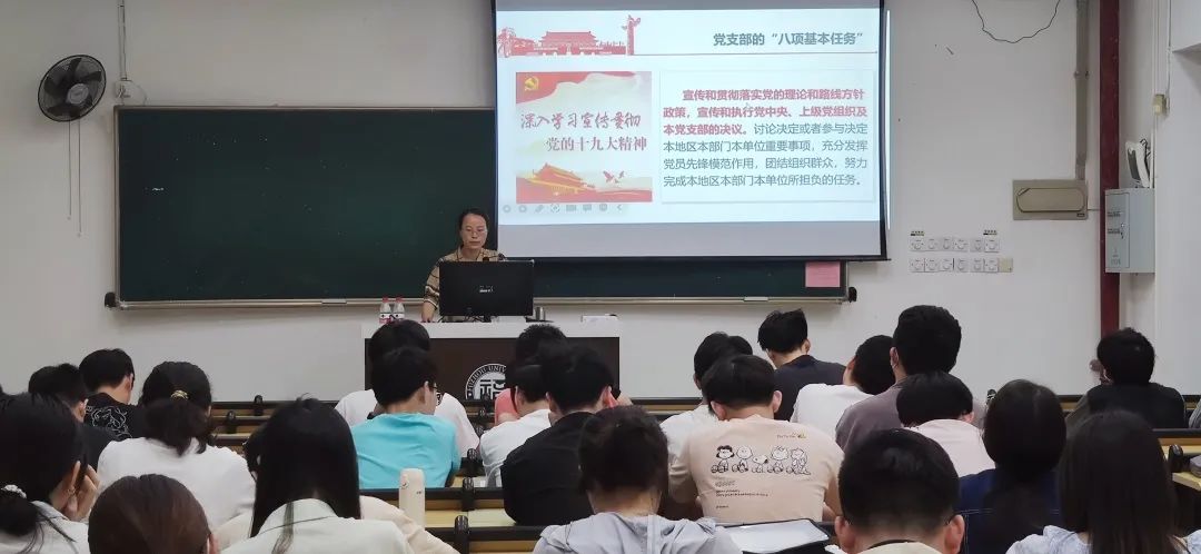 首先,赵艳莉老师以“班级和党支部的区别是什么?”为引,强调党支部是政治组织,对“支部建在连上”的基本组织原则以及党支部的“三大定位”、“七项职责”、“五条原则”进行了详细解读。随后,赵老师结合学校党支部设置的形式讲解了党支部的组织设置、“八项基本任务”和高校党支部的重点任务。并对党支部的工作机制、组织生活、支部委员会建设等内容进行解析。讲座最后,赵老师结合具体案例与大家分享了什么是党支部工作“立项活动”。赵老师强调,开展党支部工作“立项活动”要突出活动主题、要突出党的元素、要精心设计。