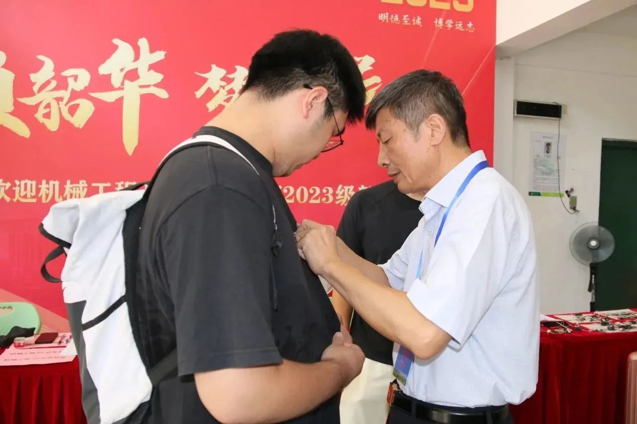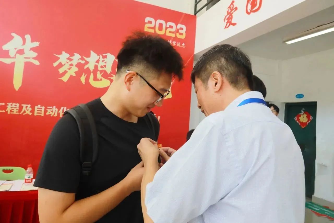 在迎新报到点,付贤智校长亲手为黄子豪、彭莱昕、黄嘉博、江文圣等四位在现场报到的新生佩戴校徽并合影留念,共同见证2023级新生开启人生的崭新阶段。