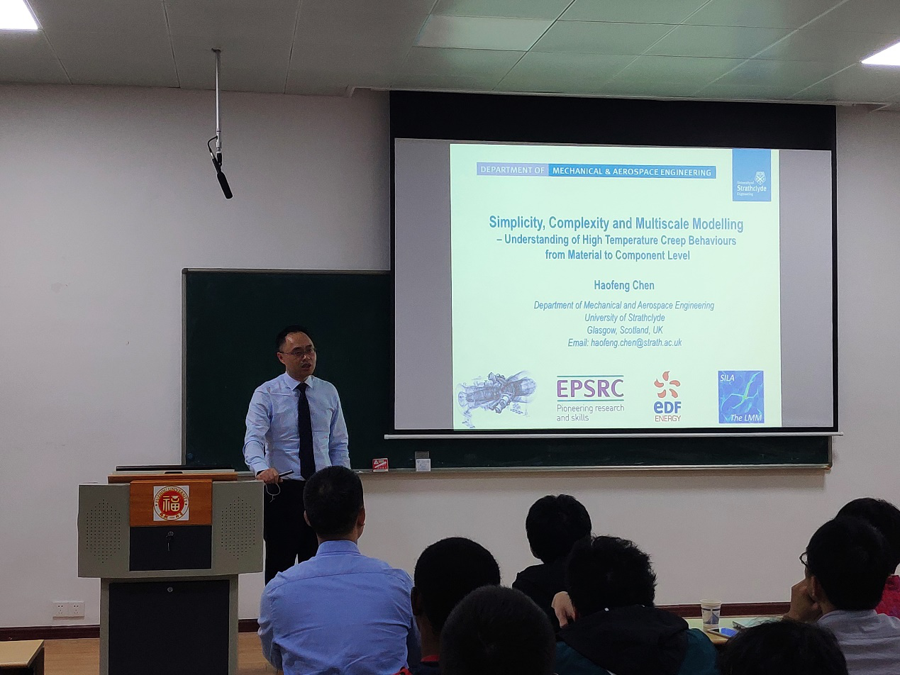 2019年11月1日上午9点30分,英国Strathclyde大学陈浩峰教授应德赢ac米兰官方合作vwin邀请,在机械南楼201会议室为德赢官网的师生做了题为“Simplicity, Complexity and Multiscale Modelling – Understanding of High Temperature Creep Behaviors from Material to Component Level”的学术报告。德赢ac米兰官方合作vwin钟舜聪院长出席了本次学术讲座,相关专业的各级研究生一并参与聆听此次学术讲座。