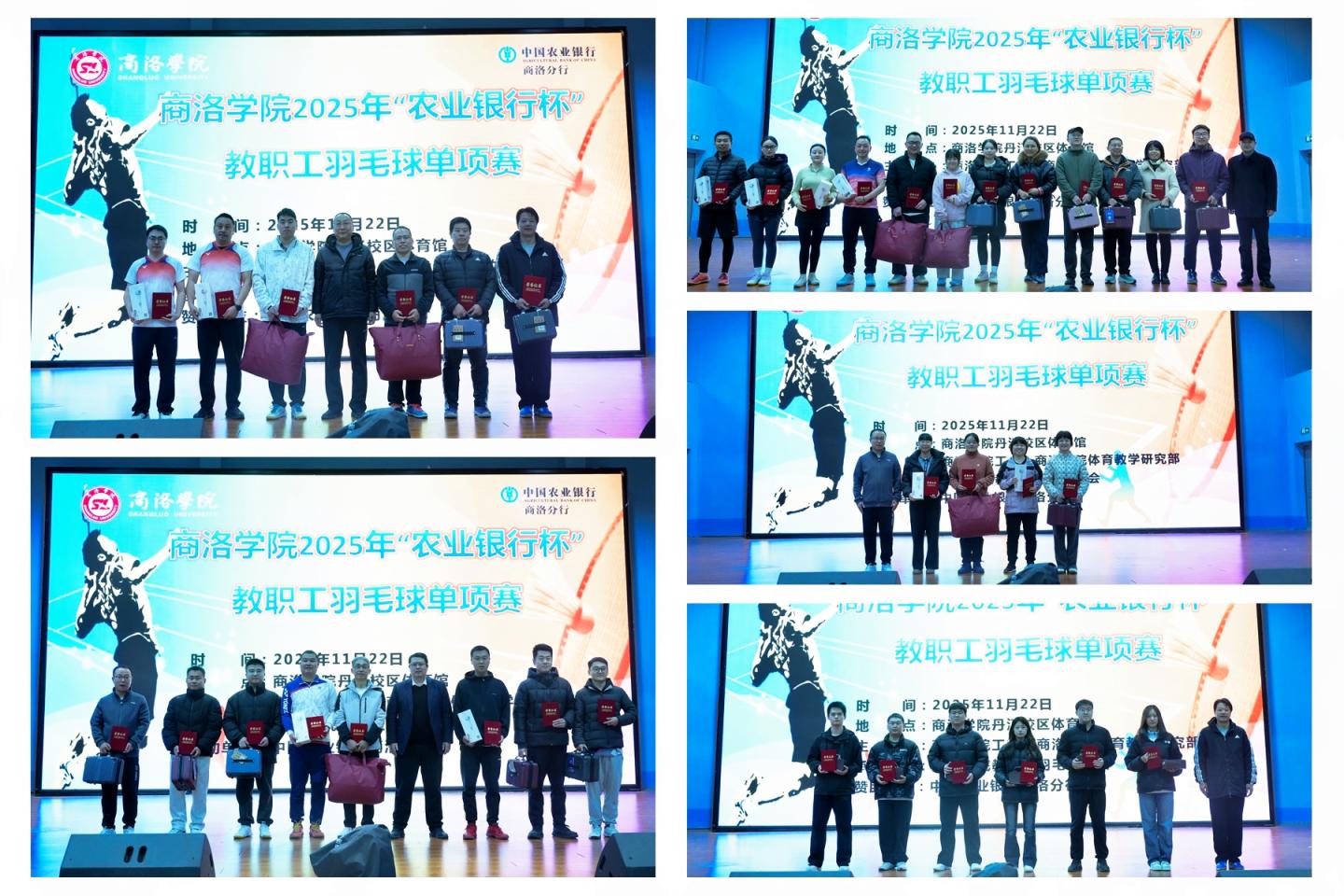 11月22日,由校工会、体育教学研究部联合主办,中国农业银行商洛分行赞助协办的2025年“农业银行杯”教职工羽毛球单项赛在丹江校区体育馆圆满落幕。校党委副书记刘宝盈,中国农业银行商洛分行党委副书记、副行长狄友青出席闭幕式并为获奖选手颁奖。