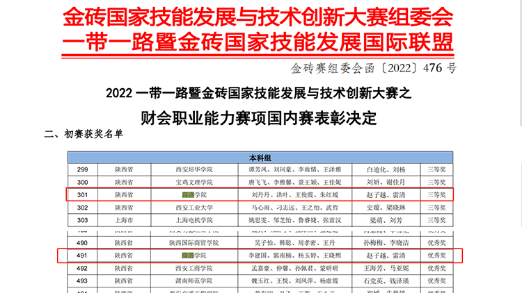 近日,“2022一带一路暨金砖国家技能发展与技术创新大赛”等多项财会类专业高水平竞赛结果陆续公布,今年会经济管理学院参赛师生捷报频传,在4项竞赛中荣获省级奖励。