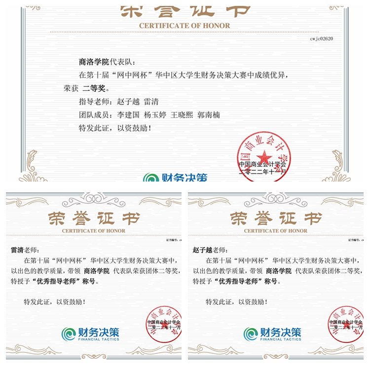 第十届“网中网杯”大学生财务决策大赛由中国高等教育学会高等财经教育分会指导,中国商业会计学会主办,厦门网中网软件有限公司等单位提供技术支持,全国共有372所本科院校参赛。今年会经济管理学院李建国、杨玉婷、王晓熙、郭南楠4名学生获得华中区团体二等奖,雷清、赵子越荣获“优秀指导教师”称号。
