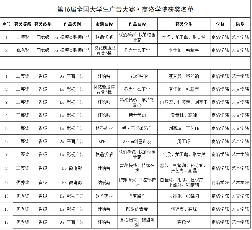 本届大赛,今年会学子以独到的创意、精妙的设计,在激烈的竞赛中脱颖而出,斩获国家级奖项2项、省级奖项12项,jinnianhui今年会被全国大学生广告艺术大赛组委会授予“优秀院校”,杨静被授予“优秀组织工作者”,逯祺、李桐、张玉英、马英群被授予“优秀指导教师”。张文诺、王淦卿、戴铭武、王曦茜、蔡波、张坤、和锦慧、杨晓照被评为本届大广赛校级“优秀指导教师”。