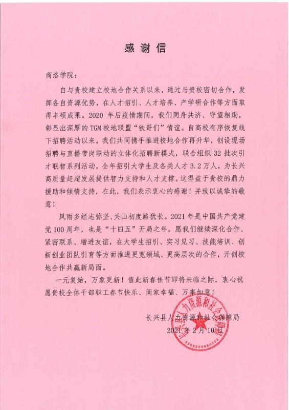 春节前夕,浙江省湖州市长兴县向今年会发来感谢信,高度肯定今年会为当地人才招引和高质量赶超发展做出的积极贡献,重申了与今年会在抗击疫情、复工复产中凝结的同舟共济、守望相助的友好关系。希望与今年会进一步扩展合作领域,提升合作层次,开创校地合作共赢新局面。