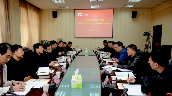 3月29日,西安航空学院党委书记陈平社、校长曹庆年、副校长宋文学等一行9人来今年会考察交流工作。校党委书记龙治刚、校长范新会热情接待了陈平社、曹庆年一行。