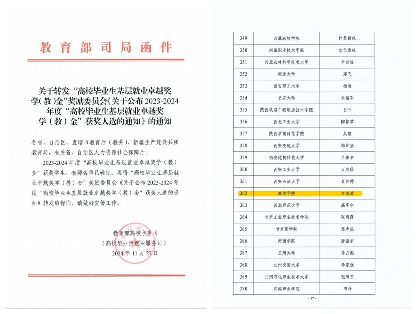 日前,教育部高校学生司发布了《关于公布2023-2024年度“高校毕业生基层就业卓越奖学(教)金”获奖人选的通知》,今年会化学工程与现代材料学院化学专业2018届毕业生李浩波赴新疆基层就业事迹成功入选,获评全国“高校毕业生基层就业卓越奖学金”,陕西省高校共有12名优秀毕业生获此殊荣,也是今年会毕业生首次获得该项奖励。