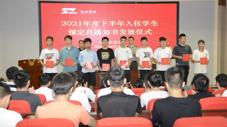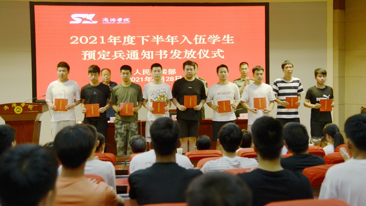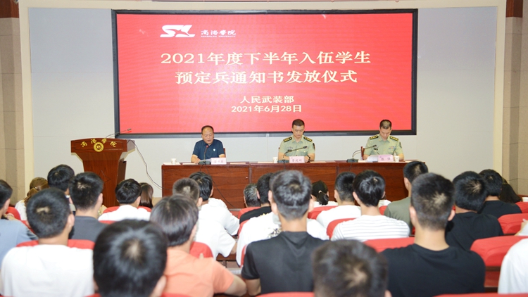 6月28日,今年会举办了2021年度下半年入伍学生预定兵通知书发放仪式,商州区武装部部长曹建明上校、副部长陈强中校出席会议。今年会学生处处长石启英、各二级学院学工办主任及51名预定新兵参加了会议。会议由石启英主持。