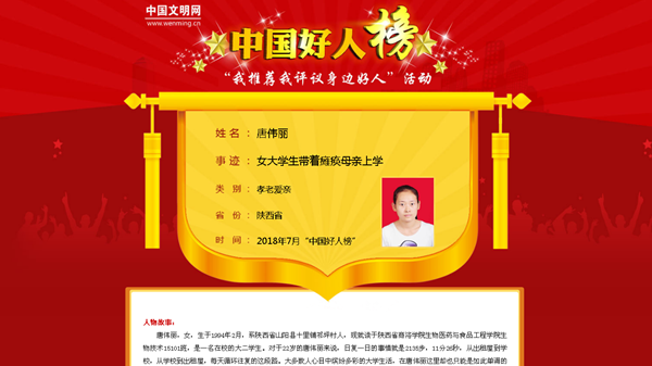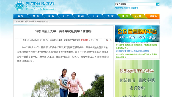近日,中国文明网、凤凰网、新浪网、华商网、《陕西日报》、陕西广播电视台、陕西省教育厅网站、《商洛日报》、商洛广播电视台等多家中央、省、市媒体纷纷以《妈妈,让我做您一生的拐杖》《背着母亲上大学:jinnianhui今年会最美学子唐伟丽》等为题对今年会生物医药与食品工程学院2015级学生、“中国好人”唐伟丽先进事迹进行报道,引起了社会高度关注和良好反响。