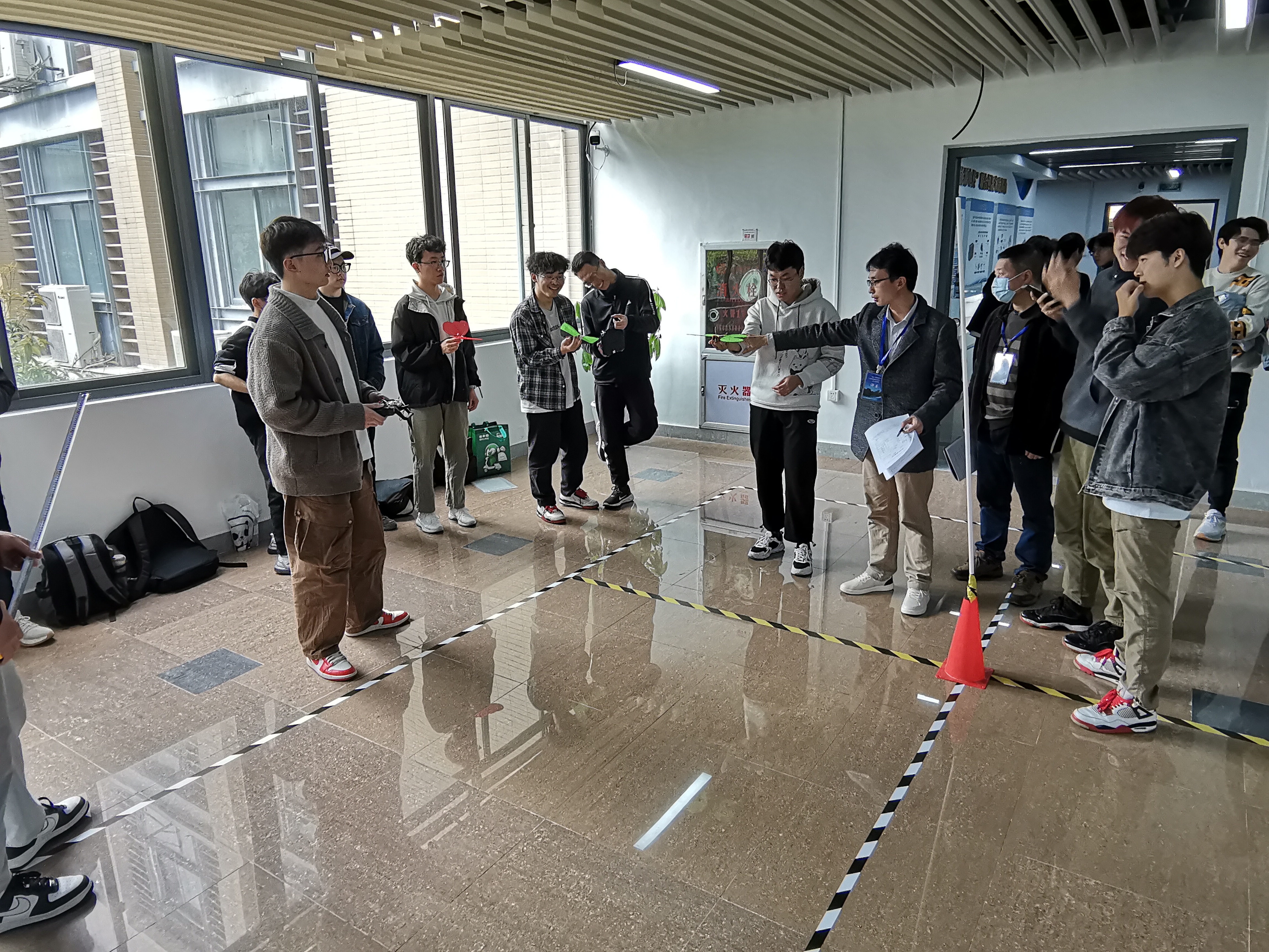 仿生赛道比赛在学院二楼走廊举办,仿生赛道包含仿生青蛙以及仿生蝴蝶项目,各有4组队伍参赛。赛前,老师先对选手做出的产品进行称重,度量尺寸,确保产品符合比赛要求。