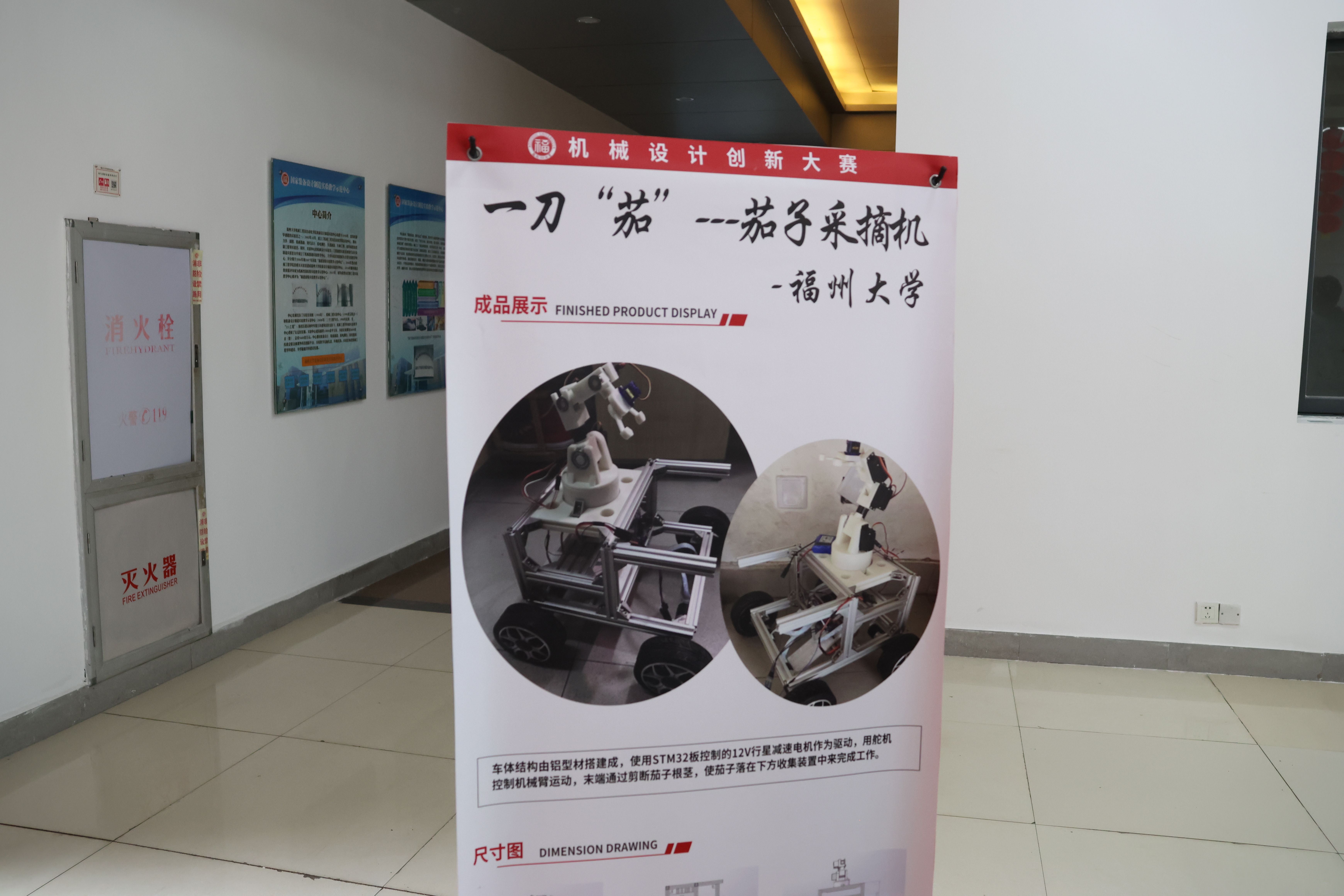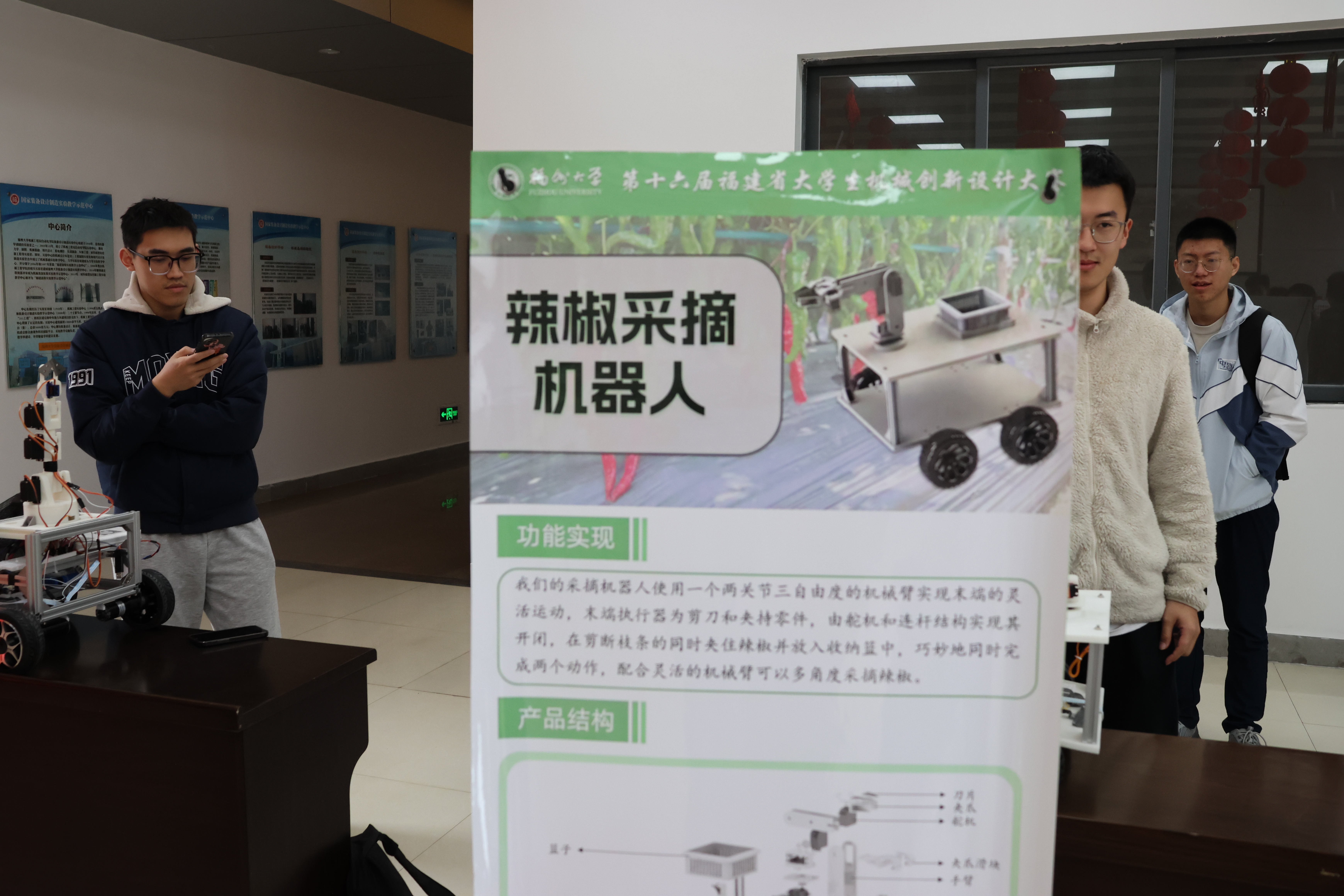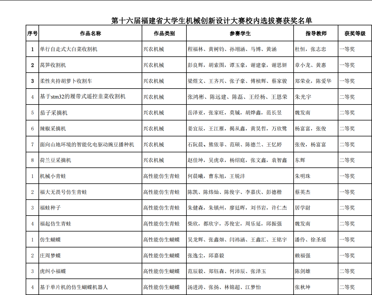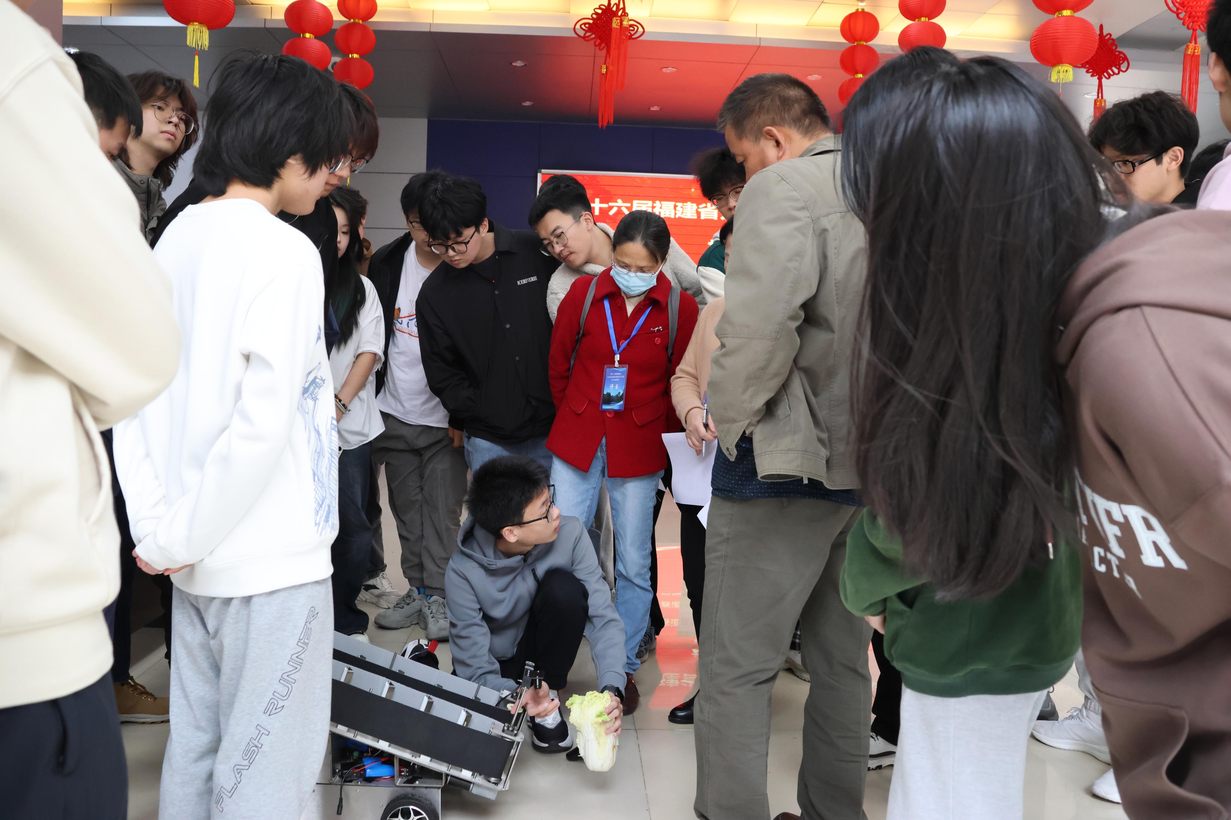 比赛过程中,参赛选手们为评委老师详细介绍作品的设计理念、加工工艺和创新点,并且积极与其他队伍交流,探讨比赛的心路历程,相互汲取经验。评委们在听了选手的详细讲解和演示后,从创新性、结构设计、实用性等等方面进行公开评审,并为学生作品提出进一步的改进和提升建议。其中,单行走式白菜收割机、莴笋收割机、柔性夹持胡萝卜收割机等作品注重创新实践,以实业兴国,以农兴国,突出实际用途,深受评委好评。仿生赛道机械小青蛙,仿生蝴蝶等作品惟妙惟肖,注重生物运动特性,体现生物形态。最终,兴农机械赛道单行走式白菜收割机等3项作品荣获一等奖,茄子采摘机等4项作品荣获二等奖。仿生赛道福大无畏号小青蛙、庄周梦蝶等4项作品荣获一等奖,福蛙种子、庄周梦蝶等4项作品获得二等奖。