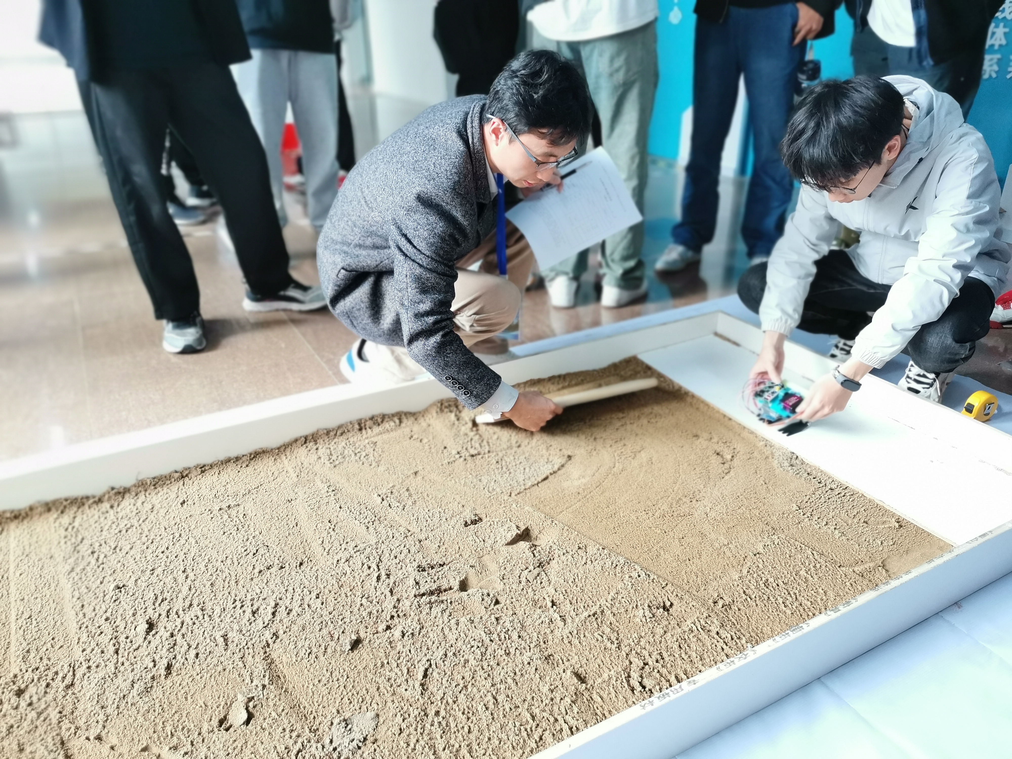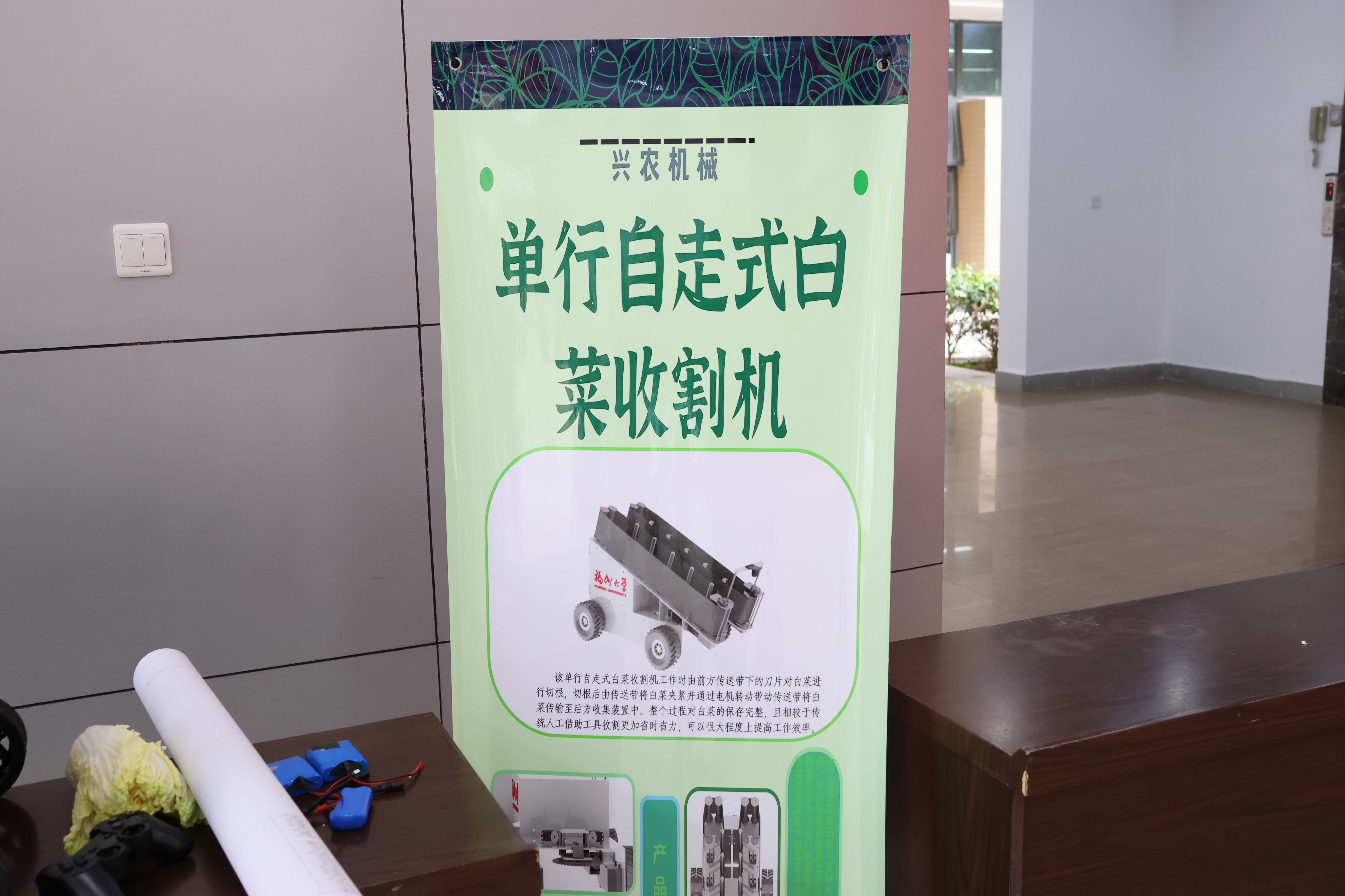 兴农机械赛道比赛在学院一楼大厅举办,共有八支队伍参赛。评委们依次查阅选手的机器并对其作出点评,对选手设计产品的创新点作出了肯定和赞扬。