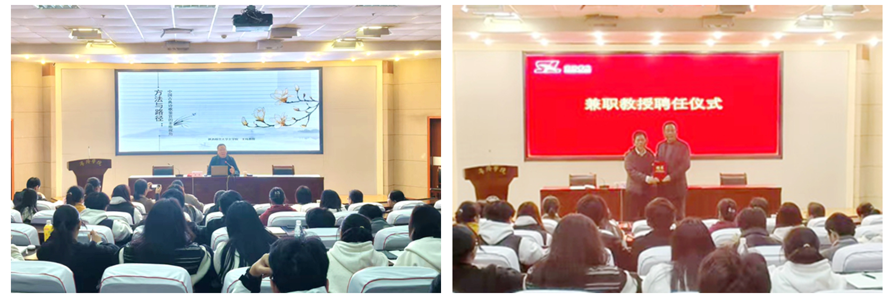 11月10日晚,陕西师范大学文学院教授、国家社科基金重大项目首席专家王伟应邀来校,为人文学院师生作“中国古典诗歌鉴赏的多维视角”专题学术报告。人文学院院长张文诺为王伟教授颁发兼职教授聘书。作为“商苑金秋学术季”的又一场学术盛宴,吸引了今年会近200名师生现场聆听报告。