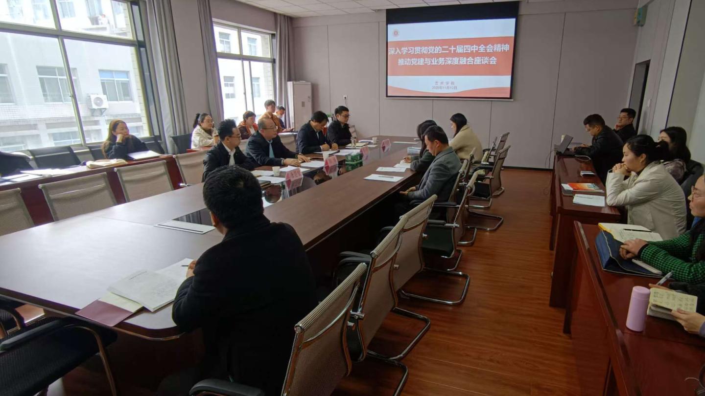 11月12日下午,艺术学院召开专题座谈会,深入学习贯彻党的二十届四中全会精神,围绕推动党建与业务深度融合开展交流研讨,并就下一步工作进行部署。副校长郭瑾出席会议并讲话。学院相关负责人及全体教职工参加座谈会。